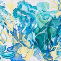Daarnaast is ook met de sjablonentechniek gewerkt; vaste vereenvoudigde patronen die samen weer een nieuwe compositie vormen. Hierbij heb ik een eigen ‘zeefdruktechniek’ ontwikkeld; met penseel de sjablonen inschilderen en deze herhalen, negatief en positief, door en over elkaar heen.